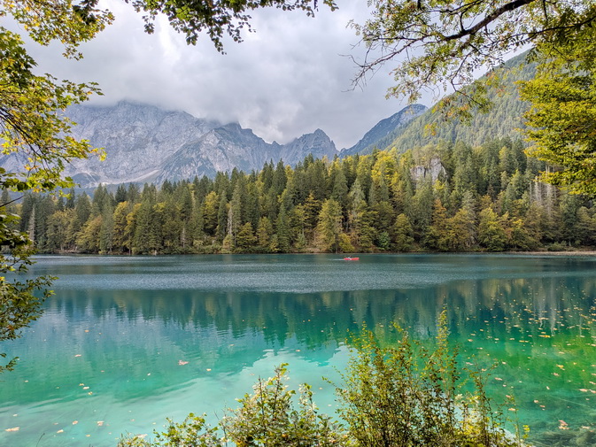 Tourentext | Vorbei an der Osteria Belvedere am See entlang nach W, dann auf der Forststraße vorbei am Kleinen Weissenfelsersee - Lago di Fusine Piccoli zur nicht markierte Forststraße, auf tw. verwachsenem alten Forstweg und Steigspuren zurück |